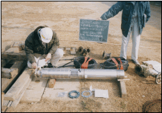 鉄道に近いことに起因して金属製井戸ケーシング管の腐食が著しいことから、硬質塩化ビニール管を既設ケーシング管内に設置する工事の状況を示す。