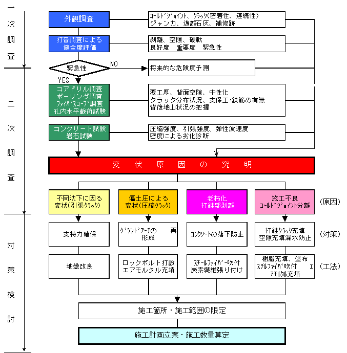 当社では、これらのコンクリート構造物の点検調査を行い、健全度評価、劣化の原因究明と対策を行っています。